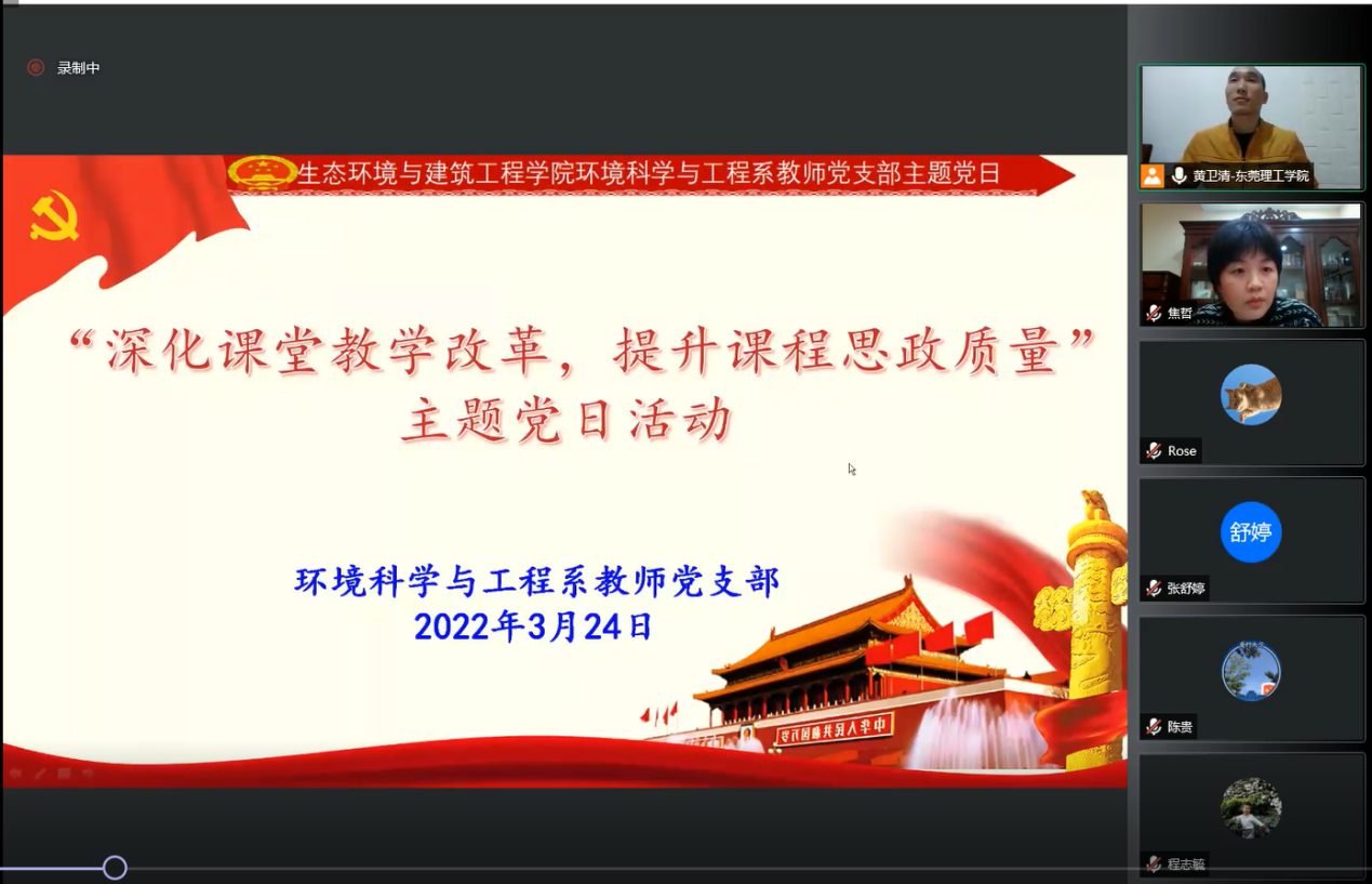 2022年3月24日,yl23455永利集团环境科学与工程系教师党支部开展了“深化课堂教学改革,提升课程思政质量”教育教学大讨论线上主题党日活动。党支部全体党员针对线上线下教学的区别结合环境学科课程特色对相关主题深度学习与研讨。