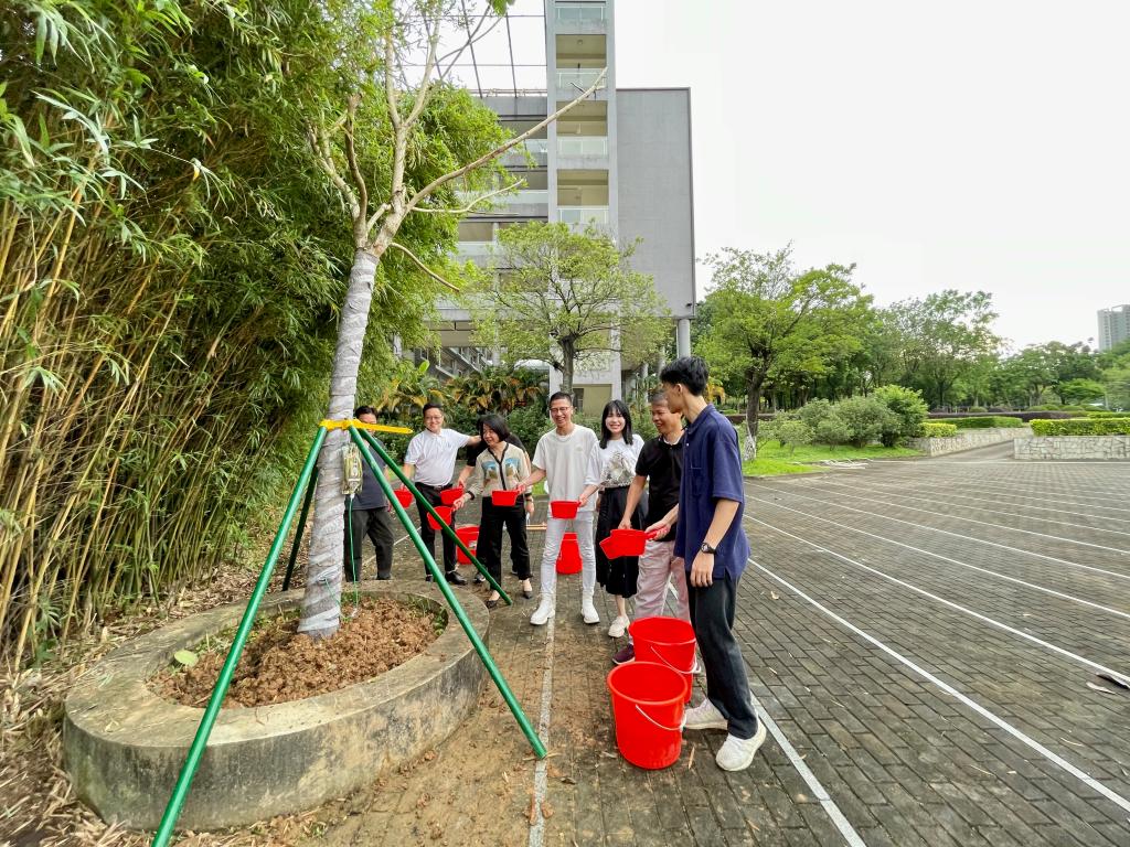 座谈会结束后,来访校友与师生代表一起培土植树,并合影留念。