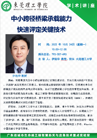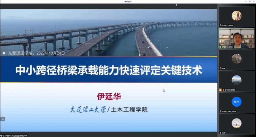 2022年10月24日上午,我院广东省城市生命线工程智慧防灾与应急技术重点实验室学科邀请大连理工大学土木工程学院院长伊廷华教授为我院师生做了一场线上专题讲座,题目为《中小跨径桥梁承载能力快速评定关键技术》,会议由学院院长郑愚教授主持,学院教师、青年博士以及研究生等参加了此次线上讲座。