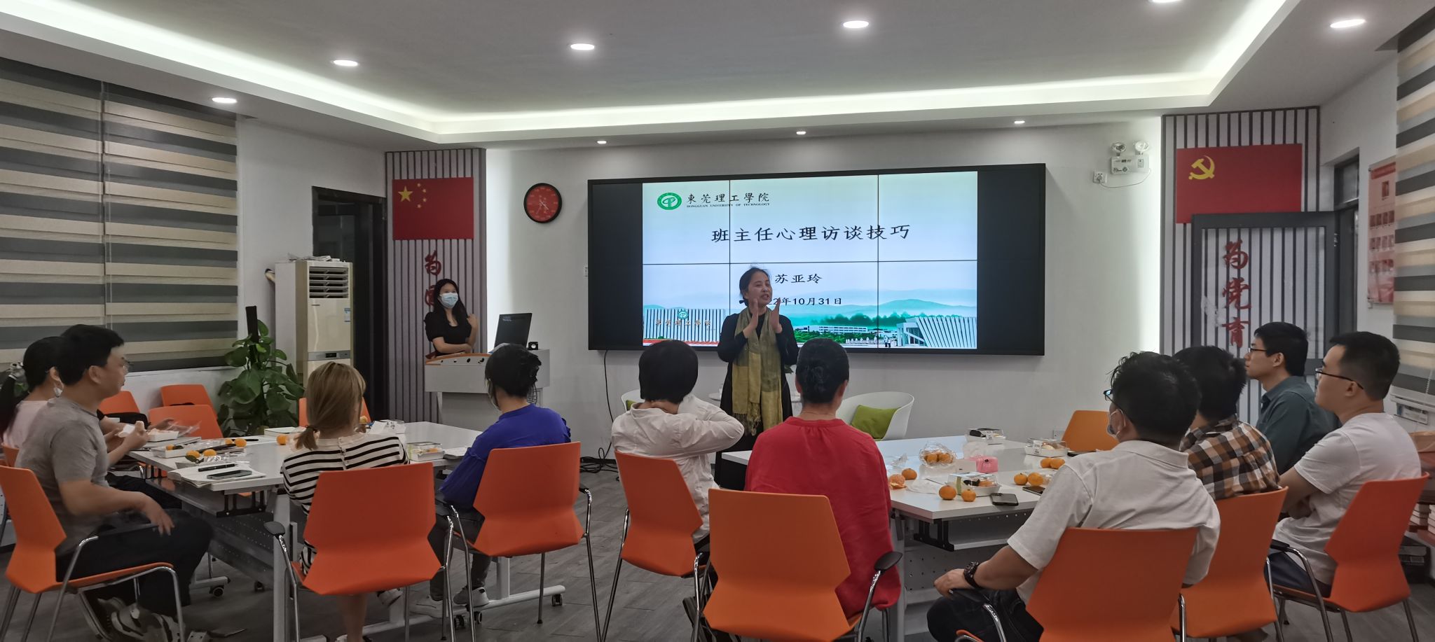 苏亚玲首先对心理访谈的对象、目的做了简短介绍,并提出了心理学在工作中的具体案例用于讨论。她指出“谈心”与思想政治教育侧重点有所区别,更偏向于疏解学生的心理问题,要求从表象入手,通过深入的对话,帮助学生发现心理问题的源头。随后,她结合案例深入浅出地介绍了谈心过程中需要的掌握的俄一些基本技巧与原则。比如真诚、理解、接纳,她提出了促进沟通效果的谈心谈话的基本原则和技巧,比如价值中立态度,设身处地理解学生的心情和感受;牢记非纠正性理念,不先入为主;学会积极倾听和关注,传达关注和理解;掌握提问和表达共情的技巧来获取更多信息、聚焦问题并安抚情绪等。