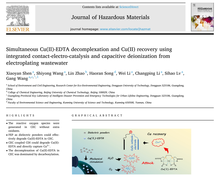 该研究成果以“Simultaneous Cu(II)-EDTA decomplexation and Cu(II) recovery using integrated contact-electro-catalysis and capacitive deionization from electroplating wastewater”为题,在环境科学与生态学1区TOP期刊《Journal of Hazardous Materials》(IF=13.6)上发表。硕士研究生沈晓妍为论文第一作者,王刚教授为通讯作者,永利y23455为第一完成单位。