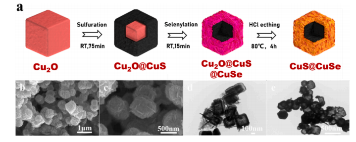而在CDI技术回收铜的过程中,电极材料的选择尤为重要。在含水铜离子电池领域,CuSe和CuS已被公认为是优异的储铜材料。硒(Se)具有良好的循环稳定性,但可逆容量有限,而硫(S)具有良好的可逆容量,但循环稳定性不足。针对这些问题,项目团队合成了一种CuS@CuSe的非均相空心核壳结构,这种结构的合成是利用Cu2O进行逐层硫化和硒化过程来实现的。合成后的CuS@CuSe拥有更多的电活性位点,并降低了反应的能垒。因此,当用作CDI的阴极材料时,CuS@CuSe表现出优异的电吸附容量(647.0 mg g-1),17.1 mg g-1 min-1的高离子传输速率和优越的循环性能。通过表征技术和密度泛函理论(DFT)计算研究了CuS@CuSe的吸附机理,并为设计和开发能够选择性捕获废水中铜离子的有效电极材料提供了有价值的见解。