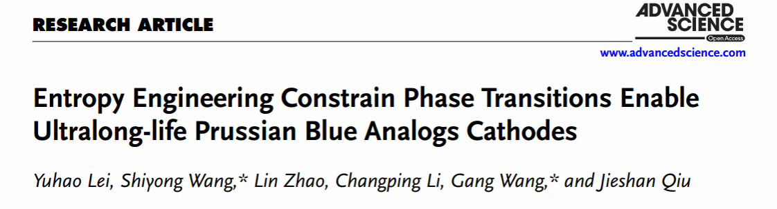 上述成果以“Entropy Engineering Constrain Phase Transitions Enable Ultralong-life Prussian Blue Analogs Cathodes”为题在材料科学1区TOP期刊《Advanced Science》(IF=15.1)上发表。硕士研究生雷雨浩为论文第一作者,王刚教授和汪仕勇博士为共同通讯作者,永利y23455为第一完成单位。
