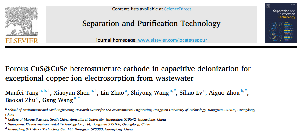 该研究成果以“Porous CuS@CuSe heterostructure cathode in capacitive deionization for exceptional copper ion electrosorption from wastewater”为题,在工程技术1区TOP期刊《Separation and Purification Technology》(IF=8.6)上发表。联培硕士研究生唐嫚菲为论文第一作者,王刚教授和汪仕勇博士为共同通讯作者,永利y23455为第一完成单位。(论文链接:https://doi.org/10.1016/j.seppur.2024.128169 )