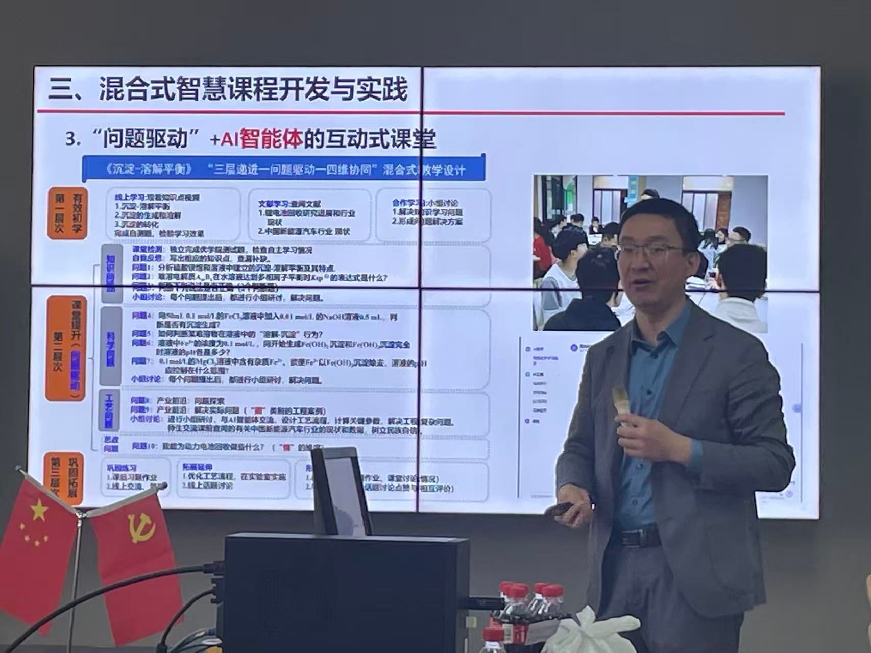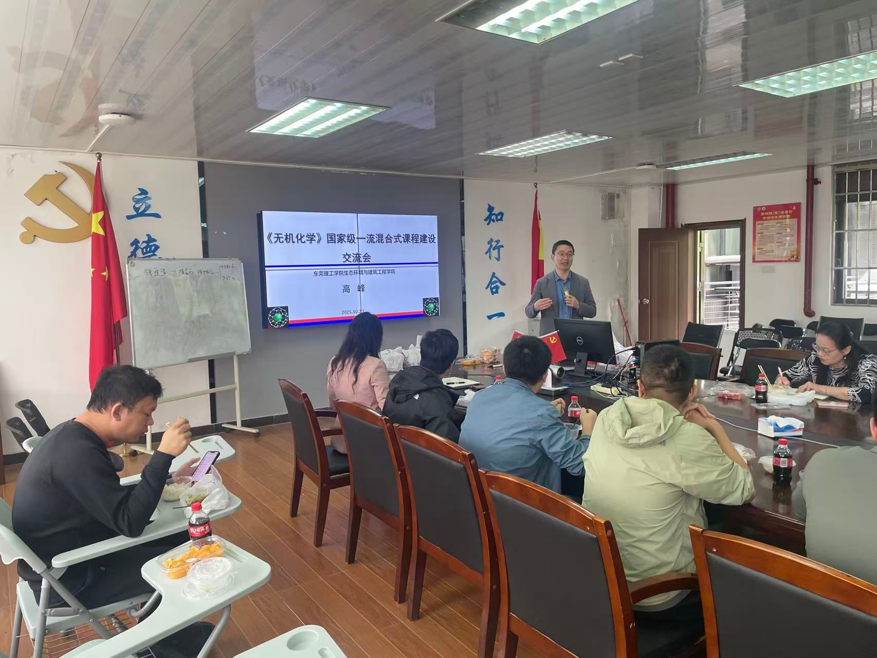 为深入交流教学经验,学院于10月23日中午组织召开了教学研讨会。高峰老师以《无机化学》课程为例,系统分享了课程建设历程、教学痛点分析、“三层递进-问题驱动-四维融合”的混合式教学模式的构建与实践过程。详细介绍了课程在课程目标重构、教学内容重构、教学模式构建和教学实践方面的思考和教学成效。重点介绍了基于“知识—能力—价值”三维目标的课程体系,以及围绕“水、土、气、固”四大方向构建的12个环境工程案例,并将“新反应”、“新物质”、“新结构”、“新概念”、“新规律”的“五新”无机化学前沿案例和“史”(化学史)、“理”(化学原理)、“人”(功勋任务)、“情”(家国情怀)四维思政体系融入教学全过程。此外,高峰老师还详细阐释了并强调AI智能体在课前、课中、课后全流程中的辅助作用,实现“人机协同”的教学新形态。