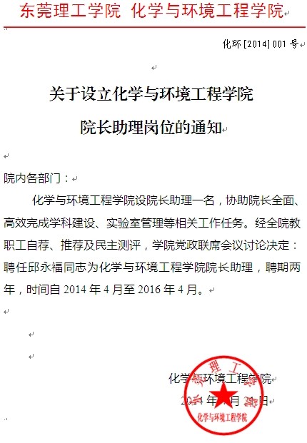 关于设立化学与环境工程学院院长助理岗位的通知
